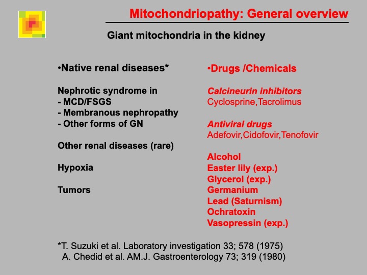 Enlarged and giant mitochondria are rarely seen in native kidney diseases with concomitant nephrotic syndrome, after ischemia, and due to drugs and poisons (alcohol, lead). The pathogenesis of giant mitochondria is unclear. Different pathogenetic factors may be involved according aetiological differences (swelling and/or fusion of mitochondria).