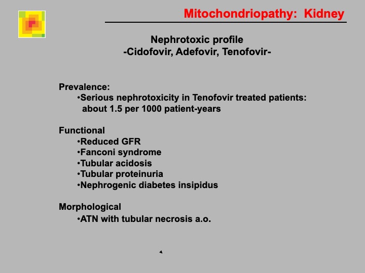 Definition: Mitochondrial abnormailies due to drugs are found in cells of the proximal tubules. The mitochondria differ in number, size (giant mitochondria / megamitochondria), shape, and structure of cristae from normal tissue. Giant mitochondria are visible by light microscopy as inclusion bodies in individual tubular cells.