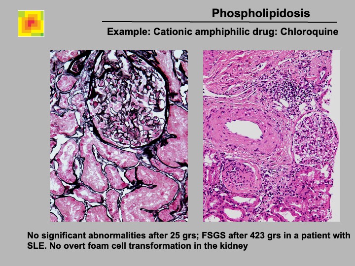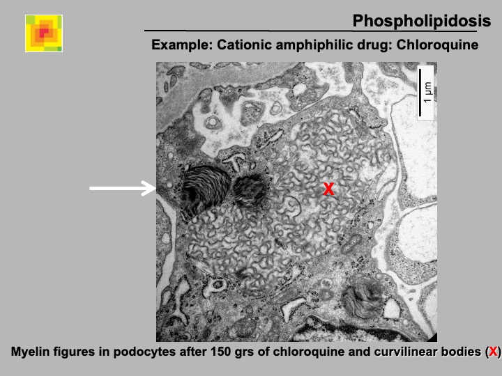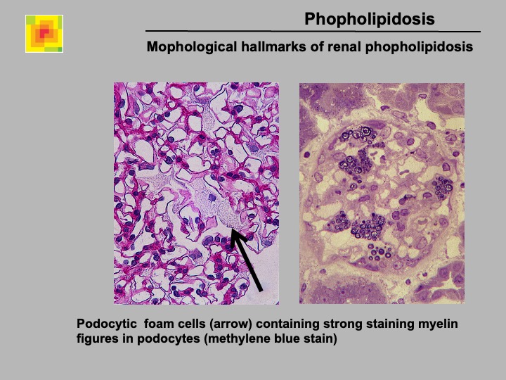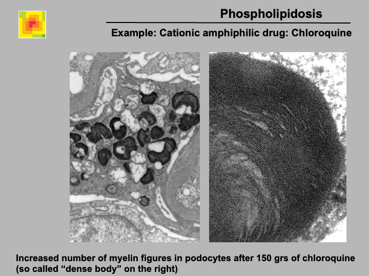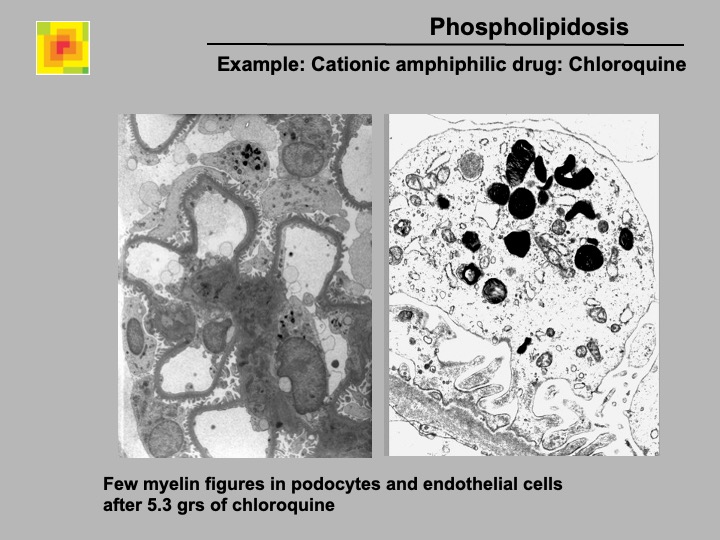 With drug-induced phospholipidosis, cellular involvement is usually more discrete. Then, only scattered myelin figures are found in podocytes or tubular epithelium, less often the endothelium or smooth muscle cells are affected.