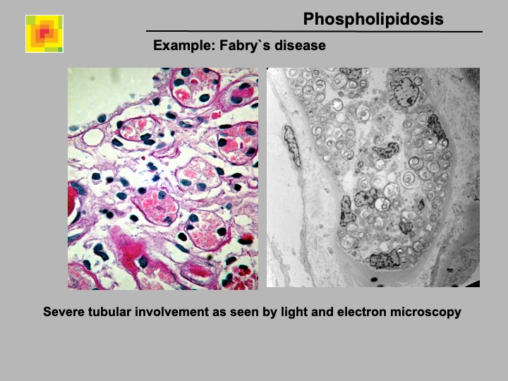 By light microscopy: The changes in the kidney due to drug-induced phospholipidosis are usually so discrete that they evade diagnosis. In particularly severe cases however, they may be so prominent that Fabry’s disease can be misdiagnosed.