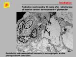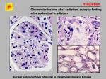 Arterioles and interlobular arteries are most severly affected by fibrin thrombi and/ or massive circular and often transmural protein deposits (arteriolar hyalinosis). The arteries may show a mucoid widening of the intimal layer and, rarely, foam cells. Endateritis is not a feature of radiation nephropathy, thrombi and arerial changes are.