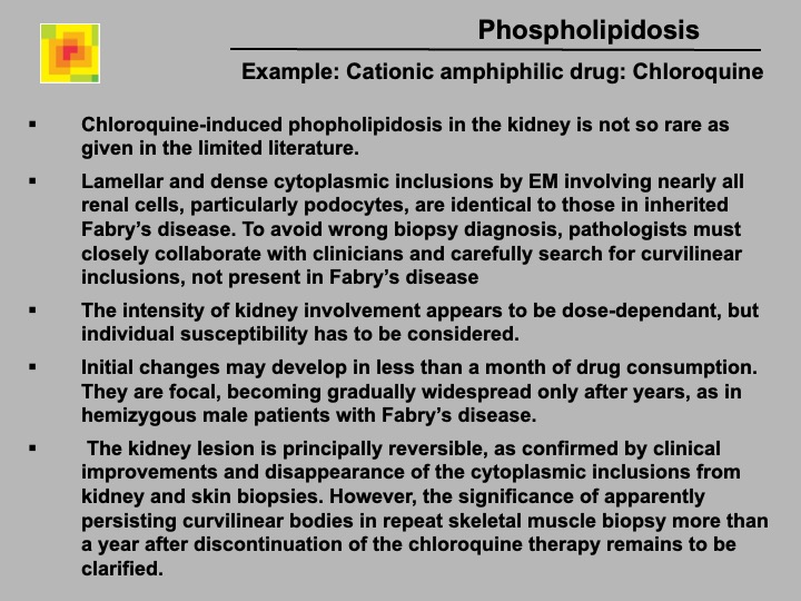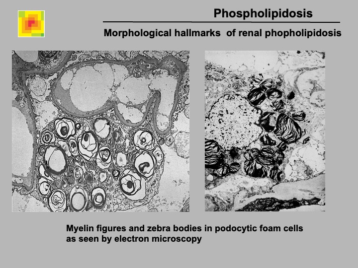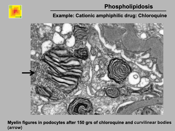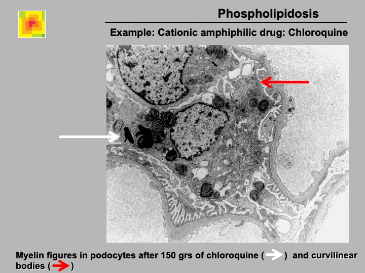 With drug-induced phospholipidosis, cellular involvement is usually more discrete. Then, only scattered myelin figures are found in podocytes or tubular epithelium, less often the endothelium or smooth muscle cells are affected.