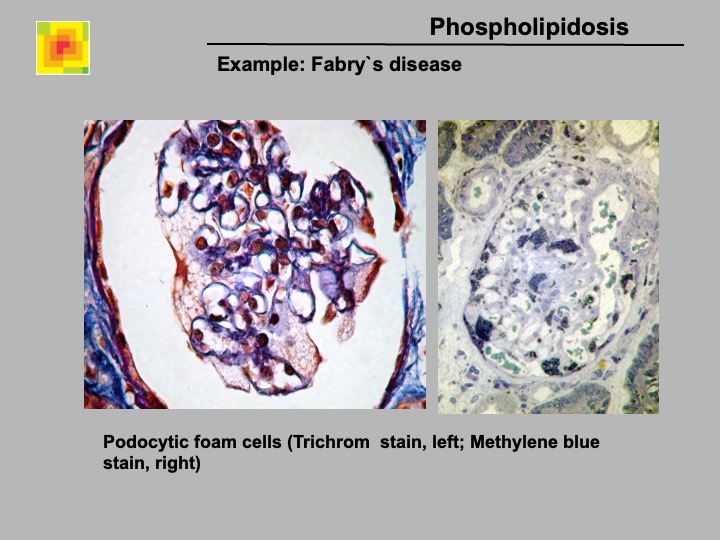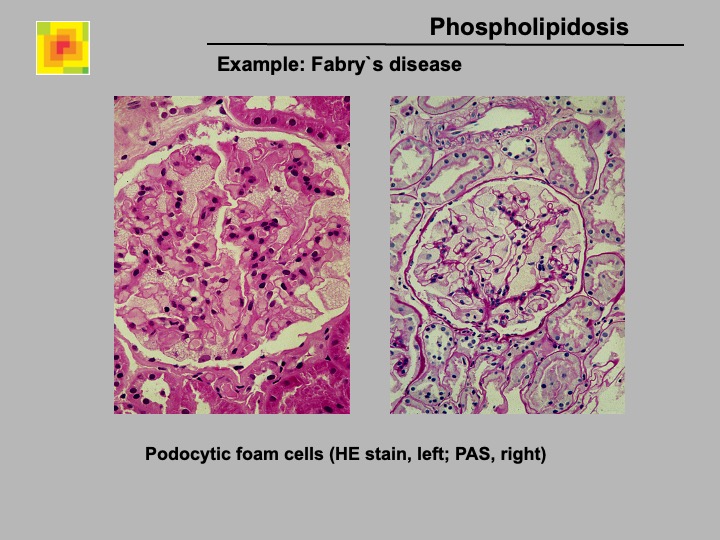 In classical cases of Fabry’s disease, foamy podocytes are evident. Vascular smooth muscle cells, as well as the tubular epithelium may also exhibit foam cell changes. Foam cells reveal a positive reaction with fat staining (Sudan stain) in frozen sections and also reveal unspecific autofluorescence (lipids). After glutaraldehyde fixation, strong methylene blue staining inclusion bodies are seen in foam cells in semi-thin sections.