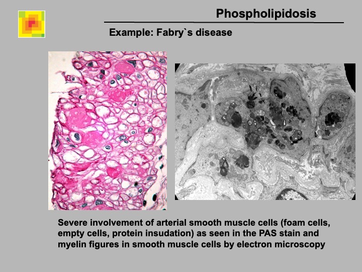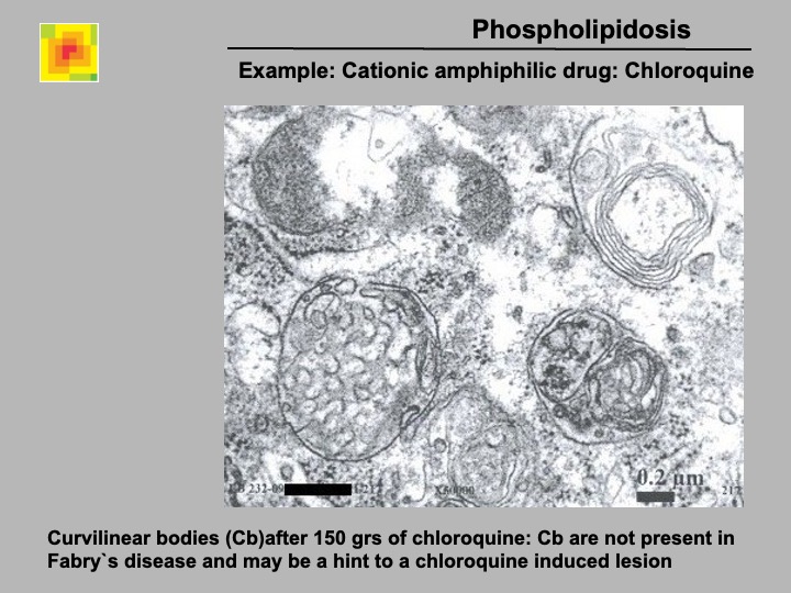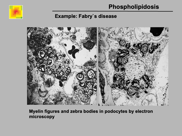 Kidney:Only Fabry’s disease and cationic amphiphilic drugs play a role in the kidney as the cause of myelin figures. Rarely, individual myelin figures of unknown etiology are found. Well over 100 cationic amphiphilic drugs are potentially capable of inducing phospholipidosis, of these only a few have relevance for the kidney. Under physiological conditions (normal kidney), myelin figures are absent.