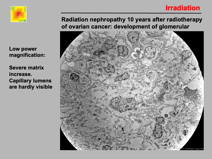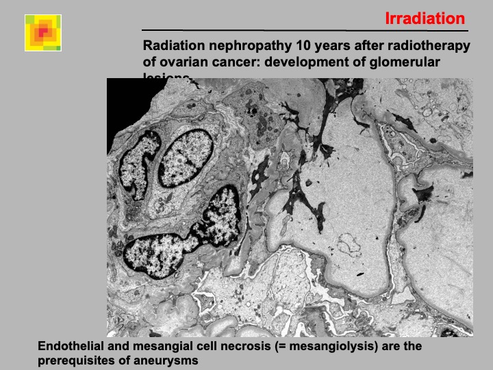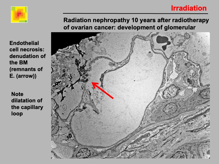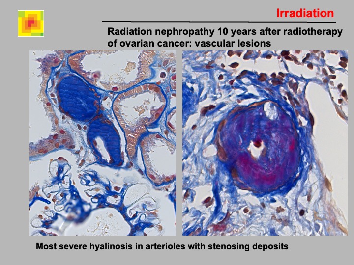 Arterioles and interlobular arteries are most severly affected by fibrin thrombi and/ or massive circular and often transmural protein deposits (arteriolar hyalinosis). The arteries may show a mucoid widening of the intimal layer and, rarely, foam cells. Endateritis is not a feature of radiation nephropathy, thrombi and arerial changes are.